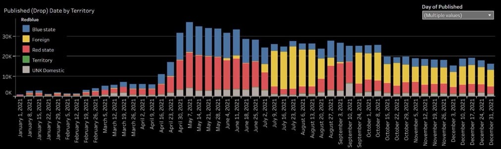 Albert sent me the graph below for all event categories in 2021, not only deaths. Foreign VAERS reports are shown in yellow, reports from red states are red, from blue states blue and reports of unknown US state origin are grey.