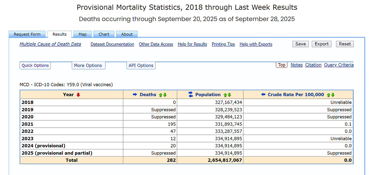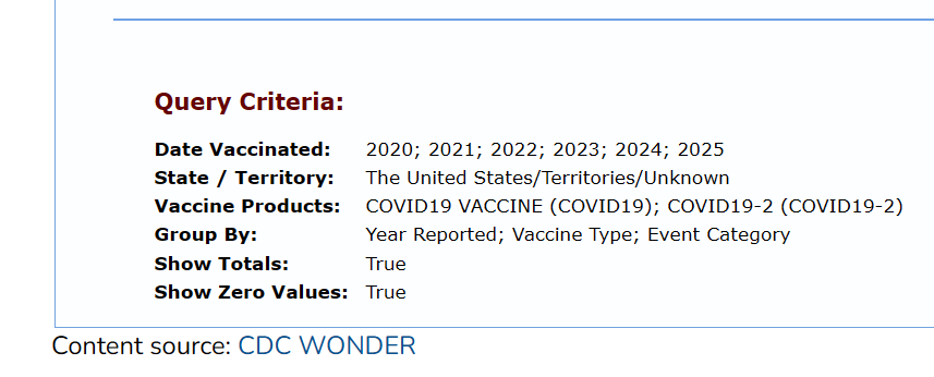 We don’t know because querying the CDC’s mortality data results in absurdly low numbers of deaths caused by the mRNA Covid shots compared to the VAERS reports. See the table below that shows the results for a query asking for deaths coded with Y59.0, viral vaccines, from 2018 to 2025: