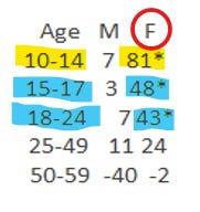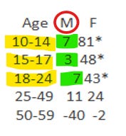 Seligmann: “If it’s zero, it means the data do not fit the linear model. So for males whether we look at injection rates of young teens, 15 to 17, 18 to 24, and so on, you have basically no correlations, seven, three, seven, eleven, and even minus 40, so no correlation.”