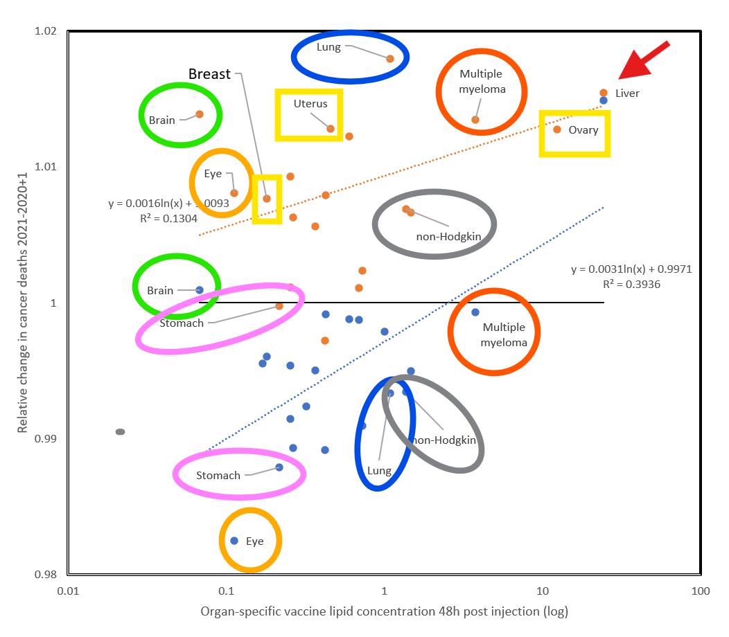 The liver, for example, with the highest concentration of LNPs, shows increased cancer rates in 2021 even for adult males.