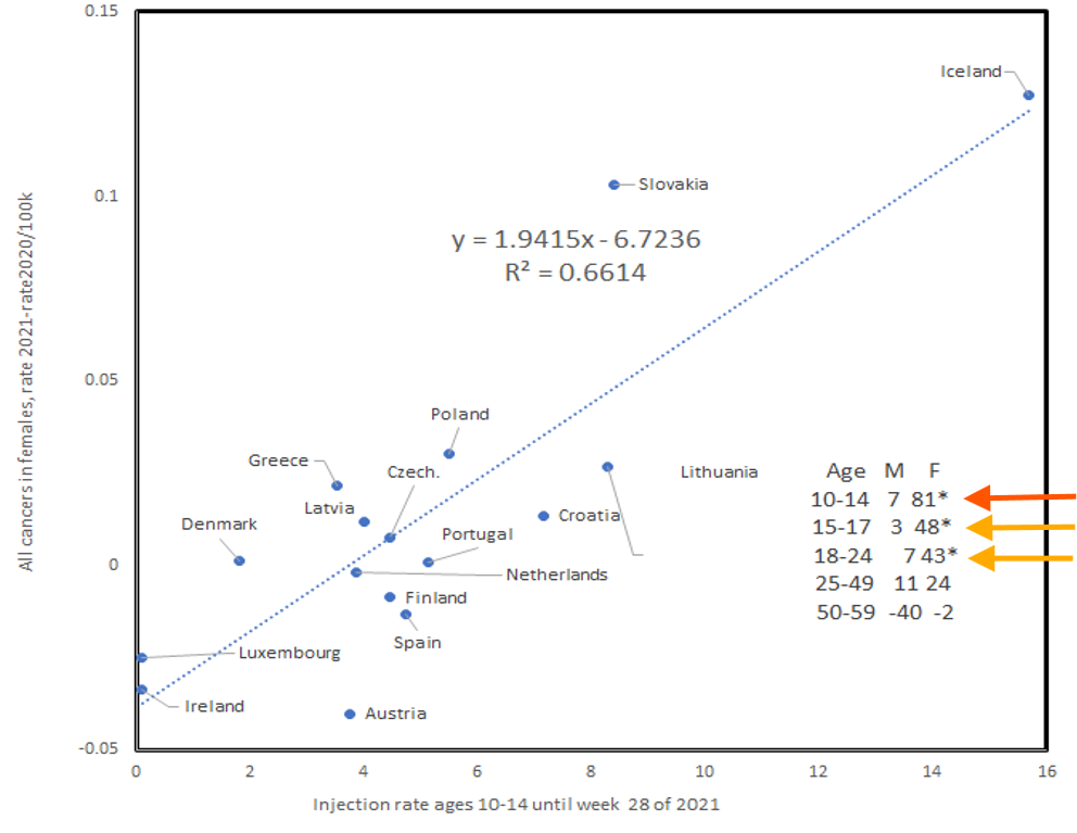He downloaded the death rates for 2020 and 2021 from 26 countries for about 60 types of diseases - cancers as well as cardiovascular, neurological and gastroenterological diseases - and he also downloaded the injection rates cumulated over the previous month up to mid 2021 for each of the age classes provided. Then he checked for correlations and found strong positive ones between teenage vaccination rates, in particular for ages 10 to 14, and increased death rates from almost all cancer and disease types in adult females - with virtually no such correlation in adult males.