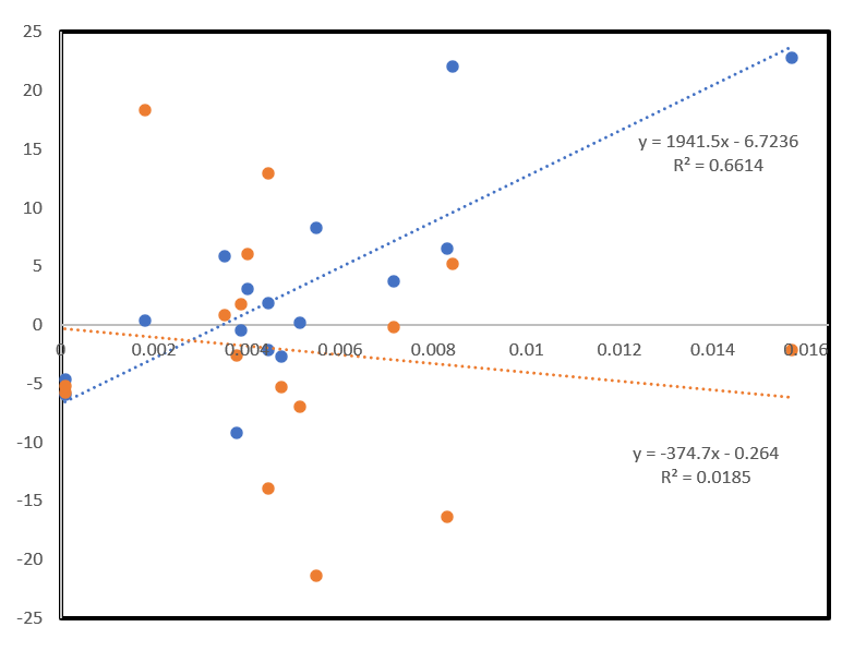 On Seligmann’s graph below you see the difference between the 2020/2021 data, downloaded in spring 2025, compared with the 2020/2021 data, downloaded in the fall of 2025. The blue dots are data from the spring download, the orange dots from the fall download. Note that the graph’s scale is different from the first graph since Seligmann multiplied the results by a thousand.